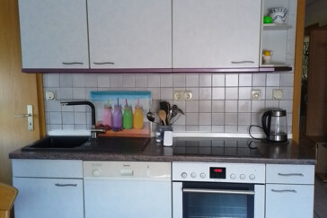1 Komplett ausgestattete Küche mit Herd, Backofen Spülmaschine, Kühlschrank, Mikrowelle, Wasserkocher, Kaffeemaschine mit Sitzgruppe für 5 Personen