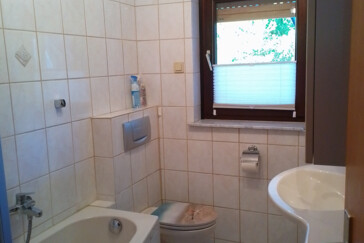 1 Badezimmer mit Toilette und Badewanne, Waschbecken