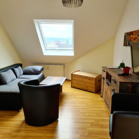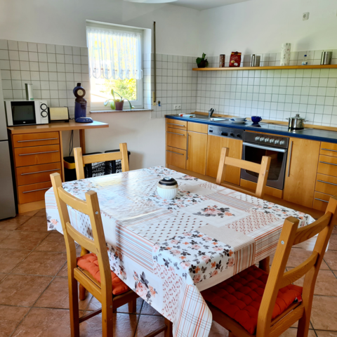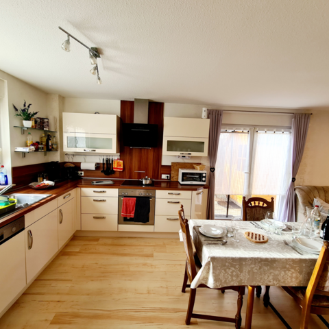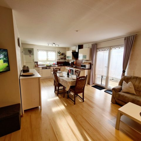 Apartment 1 für bis zu 5 Personen mit 80qm mit Wohnbereich mit voll ausgestatteter Wohnküche inkl. Cerankochfeld, Backofen, Geschirrspülmaschine, Kühlschrank mit Gefrierfach und Mikrowelle.