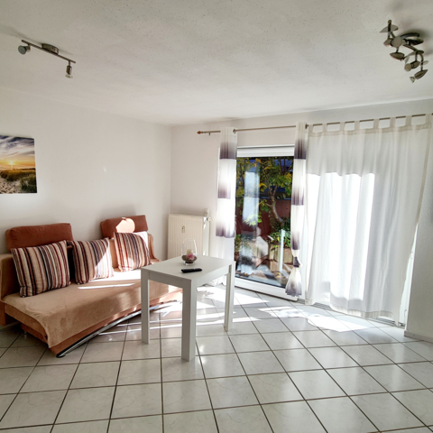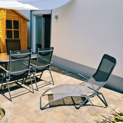 Wohnzimmer mit Sofa, Flachbild TV inkl. Netflix und Zugang zur Sonnenterrasse, ruhig gelegen mit Gartenmöbel und Gartenhaus. Eingangsbereich mit Garderobenmöbel, 1 Schlafzimmer mit 2 Einzelbetten. 1 Schlafzimmer mit 3 Einzelbetten.