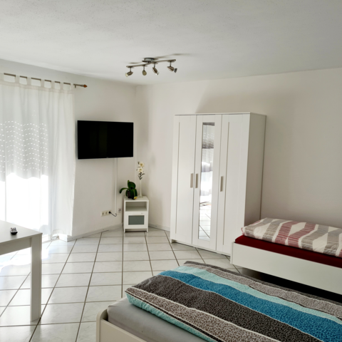 Single Apartment mit Wohn/Schlafbereich mit TV und Einzelbett, Singleküche, Bad mit Dusche und WC, Sitzgelegenheiten im Aussenbereich