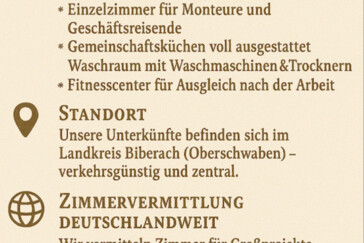 Wir bieten Küchennutzung, WLAN, Aufenthaltsräume, Parkplätze, Waschmaschinen.