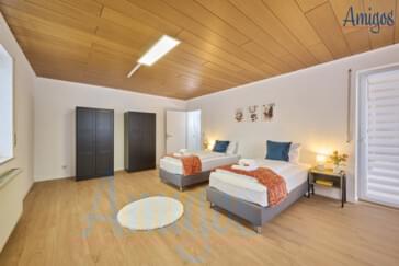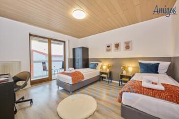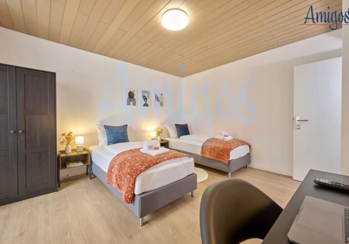 Wohnung 1 verfügt über 2 Schlafzimmer, jeweils ausgestattet mit zwei Boxspringbetten, die flexibel als Einzel- oder Doppelzimmer genutzt werden können.