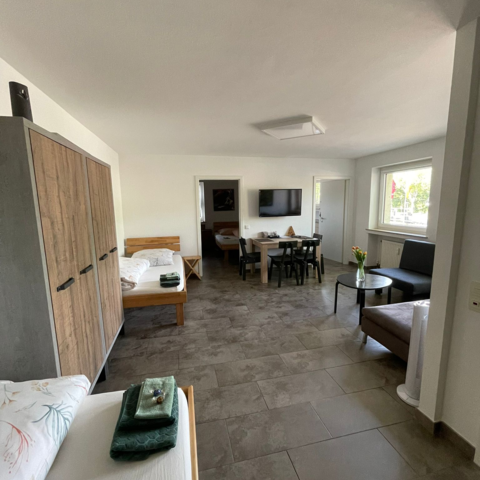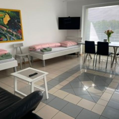 Flat 2 ist eine Zweizimmerwohnung mit jeweils zwei Einzelbetten und im großen Zimmer mit drei Einzelbetten und einem TV ausgestattet. Bei Bedarf kann zusätzlich die Couch als Schlafmöglichkeit genutzt werden. Die Küche ist voll ausgestattet mit Küche mit Kühlschrank, Mikrowelle, Herd, Kaffeemaschine, Toaster und Waschmaschine.