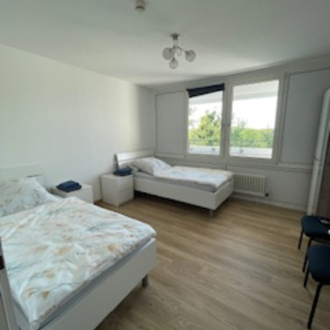Flat 3 ist eine Zweizimmerwohnung mit jeweils zwei Einzelbetten und im großen Zimmer mit drei Einzelbetten und einem TV ausgestattet. Bei Bedarf kann zusätzlich die Couch als Schlafmöglichkeit genutzt werden. Die Küche ist voll ausgestattet mit Küche mit Kühlschrank, Mikrowelle, Herd, Kaffeemaschine, Toaster und Waschmaschine.