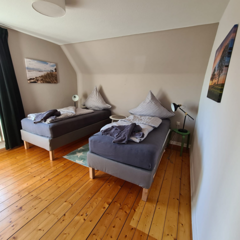 Die Wohnung im Obergeschoss ist mit drei Schlafzimmern ideal aufgeteilt: Ein Zimmer verfügt über zwei Einzelbetten, zwei weitere Zimmer bieten als Einzelzimmer maximale Privatsphäre. Auch hier schläft die 5. Person auf dem Schlafsofa im Wohnbereich. Die Ausstattung mit eigenem Duschbad und voll ausgestatteter Küche entspricht dem hohen Standard des Erdgeschosses.