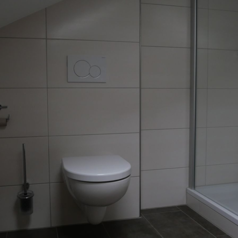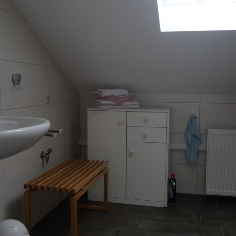 Wohnung Dachgeschoss: Eine Küche mit Essecke, ein Wohn-Schlafzimmer mit 2 Betten, die auch getrennt voneinander gestellt werden könnenmit TV, Dusche mit WC. Ein Freisitz am Gartenteich steht für diese Wohnung zur Verfügung.