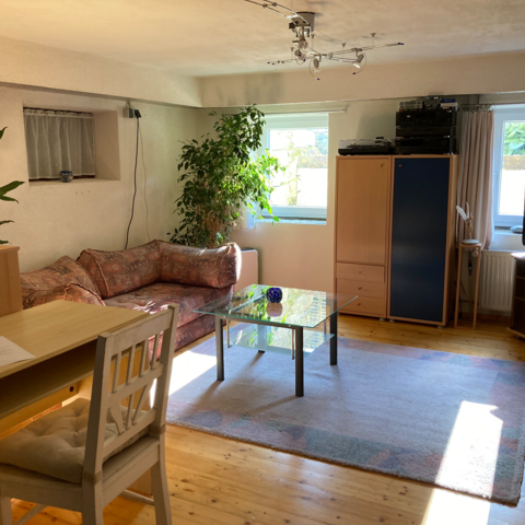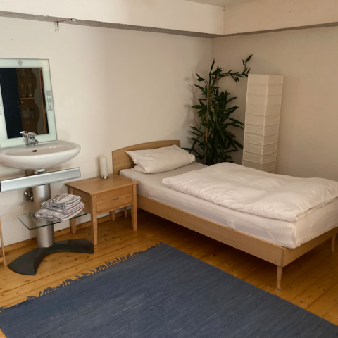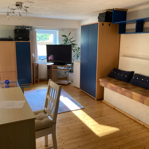 - Beim EZ handelt es sich um einen großen Wohn/Schlafraum (max. 3 Schlafplätze, Einzelbett und eine Schlafcouch 2x2 m) im UG mit TV, Kühlschrank, Mikrowelle und Waschgelegenheit im Zimmer, WC am Gang. WLAN-Anschluss, Waschmaschine kann mitbenützt werden.