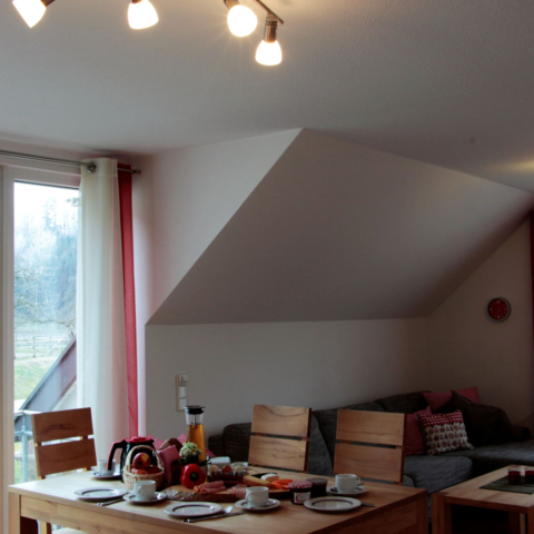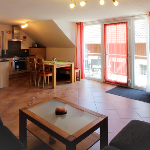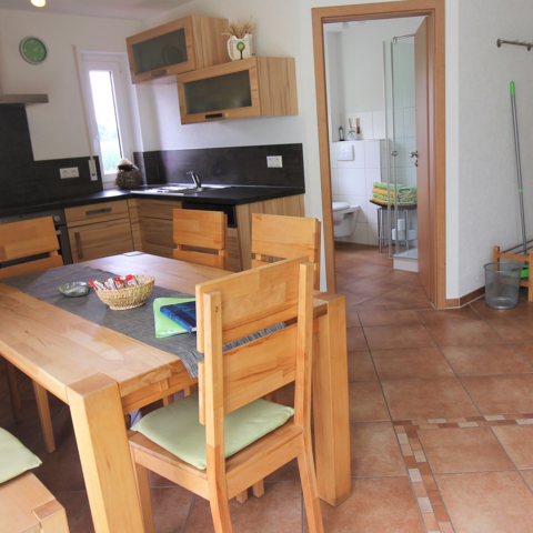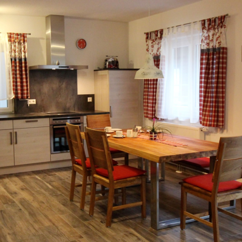 Ankommen nach der Arbeit in unseren sonnendurchfluteten 4-Sterne-Ferienwohnungen mit ein bis drei Schlafzimmern für 2-3 Personen. Genießen Sie in einer unserer 5 Ferienwohnungen den hellen Wohnbereich mit Küchenzeile, großem Esstisch und gemütlichem Sofa mit Sat.-TV, die mit Kernbuche-Massivholzmöbeln eingerichtet ist. Hier finden Sie eine gut ausgestattete Küchenzeile,in der Sie alles finden, was Sie an Geschirr, Töpfen, Besteck ... zum Kochen und Essen benötigen. Sie bringen einfach Ihre Lebensmittel und Gewürze mit und schon können Sie Ihr Essen nach Feierabend genießen. Den Abwasch erledigt dann die Spülmaschine, damit Sie Ihre Zeit zum Erholen und Auspannen nutzen können. Bei schönem Wetter, gefällt Ihnen sicherlich der kleine Tisch auf dem Balkon - Wohnungseingang mit Blick über den Innenhof, oder unser zweiter Balkon, auf dem Sie dem Plätschern des Baches lauschen. So hat jede Ferienwohnung seinen separaten Wohnungseingang.