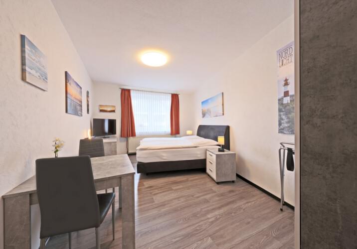 Gemütliches Apartment als Doppelzimmer mit Küche, Dusche/WC, Flachbildfernseher, Telefon, Sitzgelegenheit mit Tisch, Schreibtisch