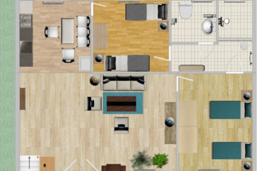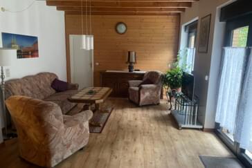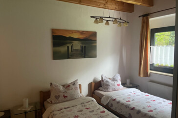 Die Wohnung verfügt über 2 Schlafräume mit je 2 Einzelbetten und separaten Zugängen zum Badbereich. In der oberen Etage befindet sich ein weiterer Schlafraum für 2 Personen. Der Zutritt für diese Gäste zum Bad in der Wohnung im Erdgeschoss führt durch einen der dortigen beiden Schlafräume!