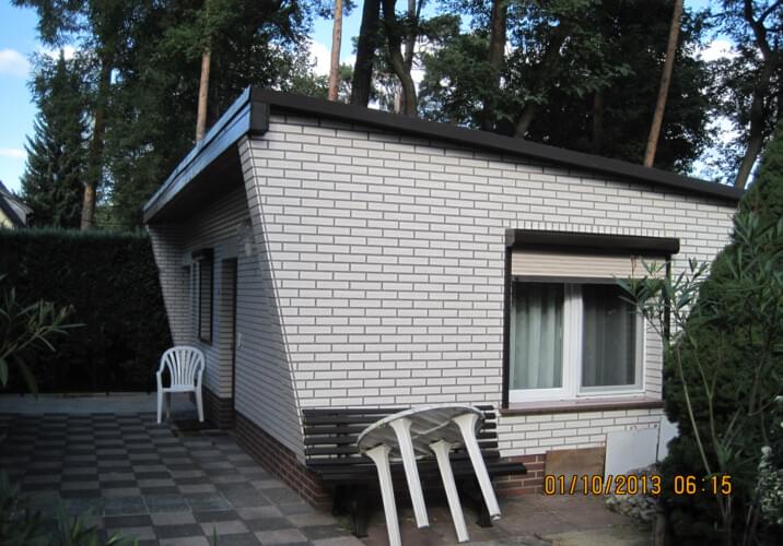 Unser Bungalow liegt ruhig am Wald und verfügt über ein kombiniertes Wohn- und Schlafzimmer.