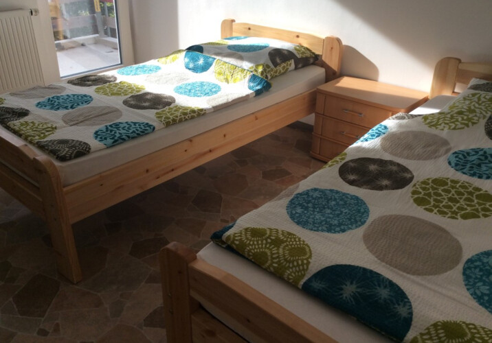 In unserem Neubau aus 2018 verfügen wir über 8 Gästezimmer mit je 2 getrennt stehenden Einzelbetten, verteilt auf 3 Wohneinheiten mit jeweils einer Küche und einem Bad zur gemeinschaftlichen Nutzung. Jedes Zimmer ist mit einem Fernseher ausgestattet.