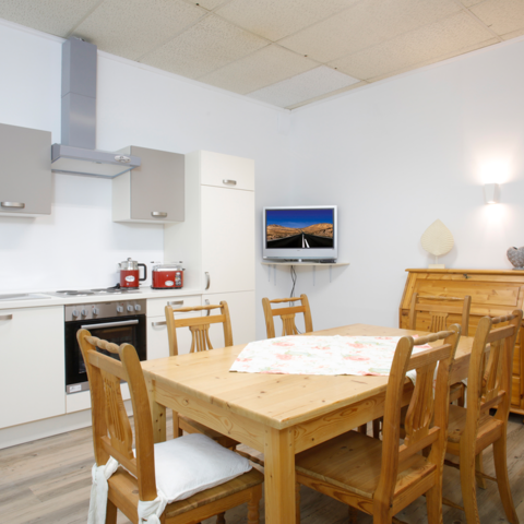 Eine zusätzliche neu ausgestattete Wohnküche mit Fernseher, Sofa und großem Esstisch für 6 Personen befindet sich ebenfalls im Erdgeschoß.