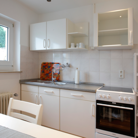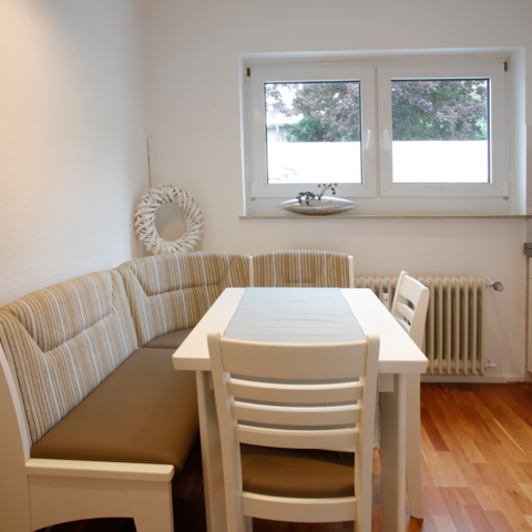 Eine eigene ausgestattete Küche mit schöner Ecksitzbank und Tisch für 4 Sitzplätze befindet sich für die beiden oben gelegenen Schlafzimmer im 1.OG.