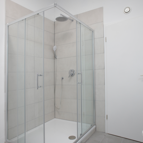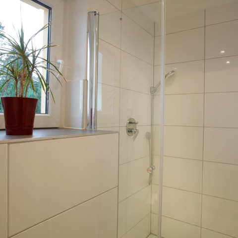 Für die 3 Gästezimmer im Erdgeschoß. wurden 2 getrennte neue Badezimmer mit Dusche/WC errichtet, ebenfalls jeweils mit elektronischem Zufuhr- und Abluftsystem.